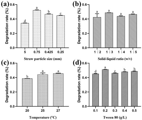 Single-factor test for screening the optimal conditions for lignin degradation in cotton straw by P. ostreatus Suping 1 with different (a) straw particle size, (b) solid–liquid ratio, (c) temperature and (d) concentration of Tween 80. a,b,c,d indicate significant differences among treatments (p ≤ 0.05).