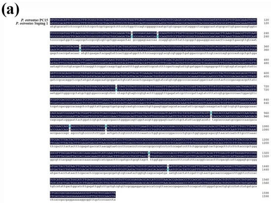 In the genome of P. ostreatus Suping 1, the full-length cDNA sequences of Lacc1 gene were 1599 bp. By comparison, the CDS sequence of the Lacc1 gene in strain P. ostreatus Suping 1 differed from that in strain P. ostreatus PC15 by nine nucleotides (Figure 2a). DNA sequence analysis showed that 20 exons were interrupted by 19 introns in Lacc1 of P. ostreatus Suping 1 (Figure 2b) and have three Cu-oxidase domains (Figure 2c). The mRNA expression level of Lacc1 gene in mycelial period (10 d, 20 d and 30 d), fruiting primordium, juvenile mushroom and maturation mushroom of P. ostreatus Suping 1 was detected by qRT-PCR, and the results showed that the expression of Lacc1 gene increased and then decreased in these culture stages of P. ostreatus Suping 1, and the highest expression was in mycelial period (30 d), followed by fruiting primordium (Figure 2d). This indicates that it may perform physiological functions more in the mycelium and fruiting primordium stage.