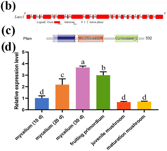 The characterization and expression pattern in P. ostreatus Suping 1 of laccase-encoding gene (Lacc1). (a) CDS sequence alignment of Lacc1 between P. ostreatus PC15 and P. ostreatus Suping 1; (b) gene structure of Lacc1 in P. ostreatus Suping 1; (c) the Pfam domain matches and features of Lacc1 in P. ostreatus Suping 1; (d) the expression pattern of Lacc1 gene in different growth stages of P. ostreatus Suping 1. Different letters above the chart columns indicate significant differences among treatments (p ≤ 0.05).