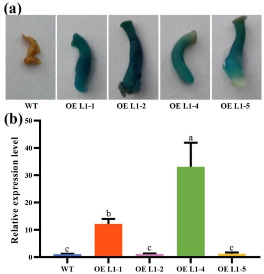 To investigate the lignin degradation function of the Lacc1 gene, the CDS sequence of the Lacc1 gene from P. ostreatus Suping 1 was cloned into pCAMBIA1304 and transformed into P. ostreatus Suping 1 using the ATMT method, driven by the Pogpd promoter. Subsequently, four transformants were randomly selected to verify whether the reporter gene β-glucosidase (gus) was inserted into the genome of P. ostreatus Suping 1. The results showed that these mutants showed the presence of the amplification product of gus. In addition, GUS histochemical assays showed that after 10 h of staining, the immature substrates of the mutants turned blue in the buffer of GUS staining, whereas the wild type did not, indicating that GUS was expressed in the mutants. The results indicated that the exogenous Lacc1 gene had been successfully integrated into the genome of the P. ostreatus Suping 1 (Figure 3a). After cultivating in the cotton straw medium for 30 days, the expression of Lacc1 gene in each transformant was detected, in which the expression of Lacc1 gene in OE L1-1 and OE L1-4 was 12.08 and 33.04 times higher than that in the wild-type strain, respectively (Figure 3b).