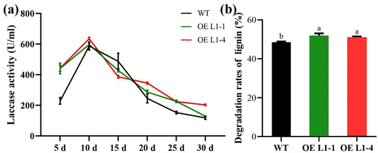 Laccase activity and lignin degradation rates of overexpressed transformants. (a) Evolution of the laccase activity of wild-type (WT) and Lacc1 gene overexpressed transformants (OE L1-1 and OE L1-4) of P. ostreatus Suping 1 in cotton straw medium; (b) lignin degradation rates of wild type and transformants after cultivating in the cotton straw medium for 30 days. Different letters above the chart columns indicate significant differences among treatments (p ≤ 0.05).