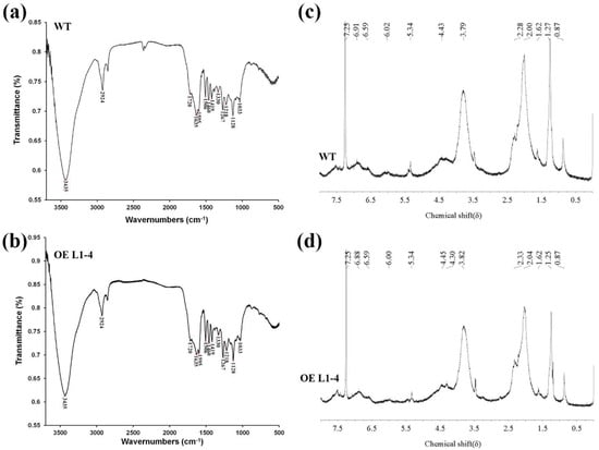 Infrared spectroscopy and 1H NMR analysis of lignin degradation products from cotton straw medium inoculated with wild-type (WT) and Lacc1 gene overexpressed transformants (OE L1-4) of P. ostreatus Suping 1 for 30 days. (a) Infrared spectroscopy analysis of cotton straw medium –inoculated with wild-type strain; (b) Infrared spectroscopy analysis of cotton straw medium inoculated with OE L1-4 strain; (c) 1H NMR analysis of cotton straw medium inoculated with wild-type strain; (d) 1H NMR analysis of cotton straw medium inoculated with OE L1-4 strain.