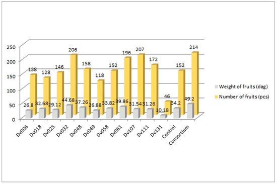 The greenhouse experiment was performed to assess the influence of bacteria on tomato yield. In total, 13 treatments were tested, including negative control, consortium, and each of the 11 strains comprising the consortium (Figure 1, Figure 2 and Figure 3). The plants in all treatments were grown in the soil until the fruits appeared. The crops were harvested continuously, counted, and weighed until no new fruits were available. The results showed an increase in both the number and weight of fruits, in comparison to the control group (Figure 1).