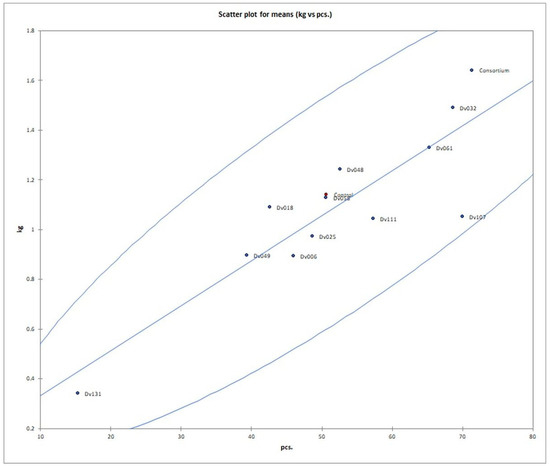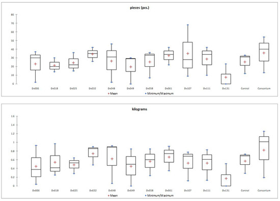 The number of fruits after consortium treatment was 41% (p = 0.004947) higher in comparison to the control group (Control), and the total mass of yielded fruits increased by 44% (p = 0.005165). The second highest yield was obtained for treatment with strain Dv032, where the number and mass of yielded fruits increased by 35% (p = 0.003308) and 30% (p = 0.004175), respectively, in comparison to the control group (Control) (Figure 1). The significant increase in tomato yield for both the number and the mass of fruit of bacteria-treated tomato plants is visualized by the bar graph (Figure 1). Results of statistical analysis of the quantity and mass of the yield of tomato fruits are presented using a box-plot (Figure 2) and scatter plot (Figure 3). As an addition, the phenotype of tomato plants was presented in photographs, in the Supplementary Materials (Figure S1).