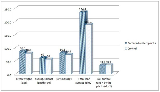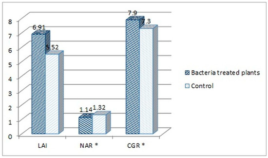 The following plant growth indexes: leaf area index (LAI), net assimilation rate (NAR) and crop growth ratio (CGR), were assessed for the tomato plants treated with the consortium bacteria, as the best performing group in the experiment. The indexes were calculated based on the measurement of plants’ fresh weight, average length, dry mass, and leaf surface. When comparing the consortium-treated tomato plants with the water-treated control group, higher parameters were noted for the consortium-treated plants. The fresh weight increased by 10.47%, the average length by 10.71%, the dry mass by 8.66%, and the leaf surface by 25.28% in comparison to the control (Figure 4).