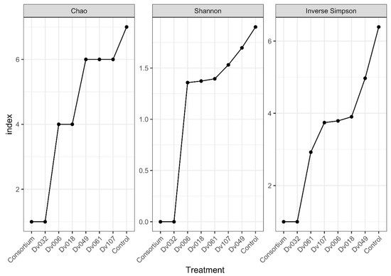 Obtained sequence data were submitted to the SRA database (https://submit.ncbi.nlm.nih.gov/about/sra/, accessed on 7 September 2022) under the BioProject ID: PRJNA877568, accessions: SRX17465903–SRX17465910. Alpha-diversity was verified using Chao, Shannon, and Inverse Simpson coefficients. All indexes show that the highest biodiversity occurs in the control sample (water), and the lowest biodiversity occurs for the bacterial consortium (Cons) and the strain Dv032, two treatments with the highest yield of tomato fruits (Figure 6).