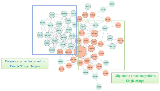 Proanthocyanidin (PAC) cluster obtained by molecular networking (MN) of grape seed extract (GSE) and its alkalinized version (ATGSE). The nodes (circles) represent a consensus MS/MS spectrum having identical precursor mass obtained from the samples, and the colors of the nodes refer to the unique property of the compound present or absent in the two samples. Blue nodes were identified in the GSE extract. Instead, red nodes represent compounds in common in the two extracts. The edges (lines) connect the nodes based on the “cosine score” (fragment match/similarity score ranging from 0.7 to 1), and the thickness of the edges reflects and measures the positive relatedness of the MS/MS spectra of the compounds within a network.