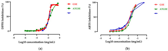 Furthermore, the results obtained by DPPH and ABTS assays of GSE and ATGSE were also expressed as EC50, which is the antioxidant concentration effective in producing 50% of the maximum response, and compared with Trolox, the reference standard. As shown in Figure 3, GSE, ATGSE, and Trolox showed EC50 values of 0.01 mg/mL, 0.02 mg/mL, and 0.11 mg/mL for DPPH assay and of 0.01 mg/mL, 0.02 mg/mL, and 0.02 mg/mL for ABTS assay, respectively.