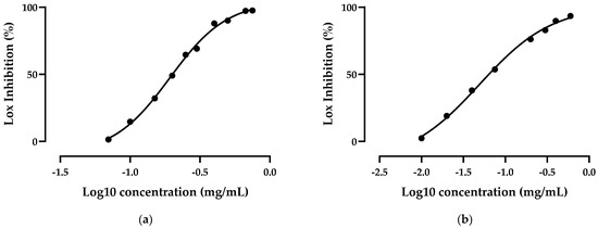 The lipoxygenase inhibitory activity (LIA) assay was performed according to the method reported by Sharifi-Rad et al. [62], with slight modifications. Briefly, 125 µL of the extract at various concentrations was added to 125 µL of soybean lipoxidase enzyme solution (final concentration of 1250 U/mL). This mixture was incubated at 25 °C for 5 min. Then 500 µL of linoleic acid solution (358 µM) was added and the mixture was incubated again for 10 min at 25 °C. A 0.2 M borate buffer solution (pH 9) was used to dissolve all components of the assay, and 750 µL of buffer was also used to dilute the final mixture. After thorough mixing, the absorbance was measured at 234 nm. The percentage (%) inhibition was calculated according to Equation (3):