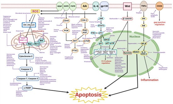 | Mixture | Fruit extract | Cranberry | JHAD1, OE19, OE33 | 50, 100 µg/mL; 24, 48 h | Inhibition of pleiotropic cell death induction | ↑ Bax and cyt c, p21, cyclin B1, PARP ↓ cyclin A, PCNA, RTK, BCL-xL | [47] | ||