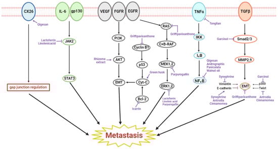 | Plant extract | Andrographis paniculata | Acanthaceae | EC109 | 800, 1600, 3200 μg/mL; 24 h | Inhibition of metastasis | ↓ TM4SF3, HER2, CXCR4, MMP2, p-NF-KB, MMP9 | [70] |