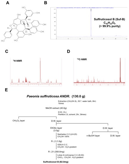 Isolation of Suffruticosol B (Suf-B): (A) Suf-B structure; (B) HPLC chromatogram, C42H32O9, >99.99% purity; (C,D) 1H NMR (C) and 3C NMR (D); and (E) isolation roadmap of Suf-B.