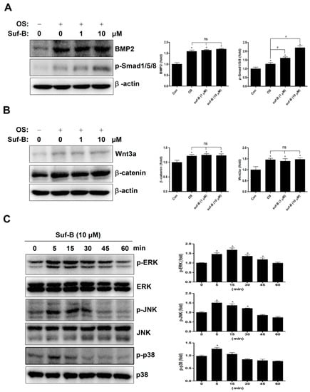 Effects of Suf-B on the osteogenic pathways. (A,B) The osteogenic pathways were determined by Western blot analysis with antibodies against BMP2, p-Smad1/5/8 (A), Wnt3a, and β-catenin (B). β-actin levels were detected as a loading control in total proteins. (C) p-ERK, ERK, p-JNK, JNK, p-p38, and p38 proteins were determined by Western blot analysis. Note: * p < 0.05 compared with the control. # p < 0.05 compared with OS. Data are representative results of three experiments.