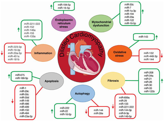 Over 2500 miRNAs have been identified in humans [10], and one third of the human genome is estimated to be regulated by miRNAs [11]. However, the function of many of them remains unknown. MiRNA deregulation has been associated with almost all diseases in humans, including cardiovascular diseases (CVDs) [12]. In this regard, miRNAs have been identified as critical regulators in the initiation and maintenance of left ventricular hypertrophy, ischemic heart disease, HF, hypertension and arrhythmias [12]. In pathological conditions, their expression levels can be found to be deregulated in circulation and/or in cardiac tissue [13]. In the last decade, many studies have reported a link between the miRNA expression profile and DCM, and many of them have been identified as potential biomarkers for diagnosis and prognosis of DCM, as well as to discriminate between etiologies [14,15,16]. In addition, several studies have elucidated a key role of miRNAs in regulating the distinct mechanisms that underlie DCM progression. In this review, we will summarize the current knowledge of the role of miRNAs in different mechanisms involved in DCM, such as inflammation, ER stress, oxidative stress, mitochondrial dysfunction, autophagy, cardiomyocyte apoptosis and fibrosis. Moreover, we discuss how the knowledge gained on the role of miRNAs that control these mechanisms can be used to generate new therapeutic approaches for the treatment of DCM.