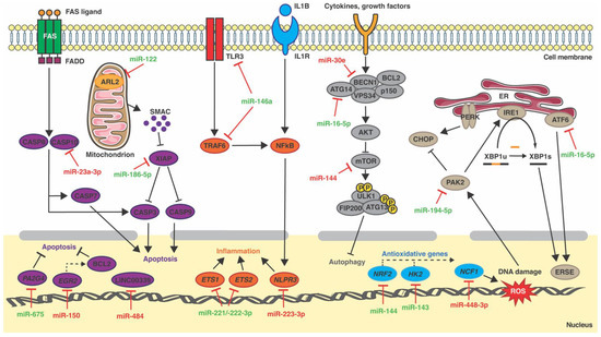 MiRNAs in cardiomyocyte inflammation, ER stress, mitochondrial dysfunction, oxidative stress, autophagy and apoptosis pathways. Green and red represent upregulated and downregulated miRNAs in the disease, respectively. FAS, fas cell surface death receptor; FADD, fas-associated death domain protein; CASP8, caspase-8; CASP7, caspase-7; CASP3, caspase-3; IL1R, interleukine-1 receptor; NFkB, nuclear factor kappa B; AKT, protein kinase B; mTOR, mechanistic target of rapamycin; CHOP, C/EBP homologous protein; ERSE, ER stress response element.