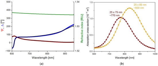(a) Scanning ellipsometry results measured on a thin (~380 nm) UDMA-TEGDMA layer without nanorods and prepared on a silicon wafer. The blue and red curves are the measured (Ψ, Δ) values, and the black curves are the fitted optical model. The green curve represents the Cauchy dispersion of the obtained refractive index in the relevant wavelength range. (b) Calculated absorption spectra cross-section of the 25 × 75 and 25 × 85 nanorods in the UDMA matrix (COMSOL simulation results).