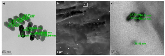 In order to check the homogeneity of their implantation into the polymer matrix, scanning transmission electron microscopy (STEM) was used. Figure 2 presents STEM images of the 25 × 75 gold nanorods after implantation into the UDMA-TEGDMA polymer matrix at a 1.9 × 1012 mL−1 concentration. The size of the nanorods was measured on images where the nanorods were fixed to a carbon filter, such as in Figure 2a. Based on 25 measured rods, the average (and standard deviation) of their longer and shorter axes are 76 (±8) and 26 (±2) nm, respectively. To measure the size of the nanorods, only those who had both ends in focus were considered. This 8–10.5% deviation from the nominal values is within the specification of the manufacturer and complies with the expected characteristics of the fabrication technology.