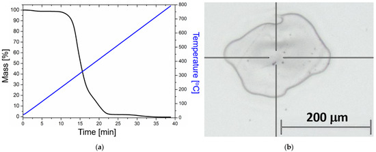 (a) Thermogravimetric analysis (TGA) performed on the UDMA-TEGDMA resin after photopolymerization. Blue: temperature ramp. Black: TGA curve. (b) Optical microscopy image of a typical crater after laser irradiation (undoped sample), where the Raman measurements were performed at the edges of the crater.