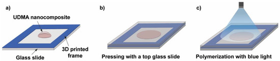 Schematic illustration of the photopolymer sample preparation steps. (a) A 3D-printed frame is glued onto a glass slide, which acts as a spacer, and a droplet of the UDMA-TEGDMA resin is deposited onto the glass slide. (b) Placing and pressing with a top glass slide onto the nanocomposite droplet. (c) Illumination with a blue light beam from a dental curing lamp for photopolymerization.