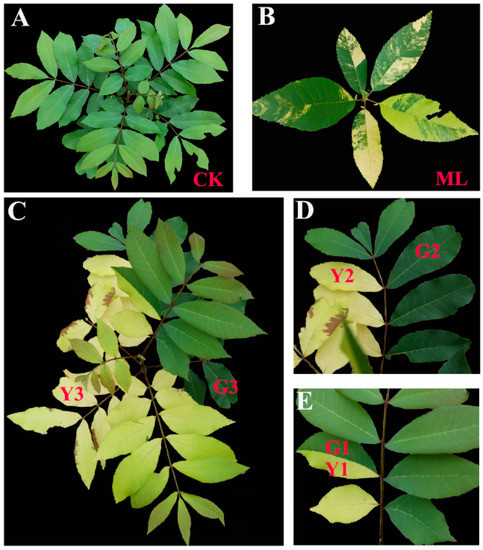The symptoms of pecan plants infection with PMV. The early developmental stage of annual seedlings bore yellow margins and green interior leaves (B). The leaf-variegated plant bore half green leaves and half yellow leaves when developing a pinnately compound leaf (C–E). The mosaic leaves (ML, (B)) were photographed at June 2019. The green leaves (G1, G2, G3) and yellow leaves (Y1, Y2, Y3) of PMV-infected plants and the leaves of healthy plants (A) were photographed in June 2020.