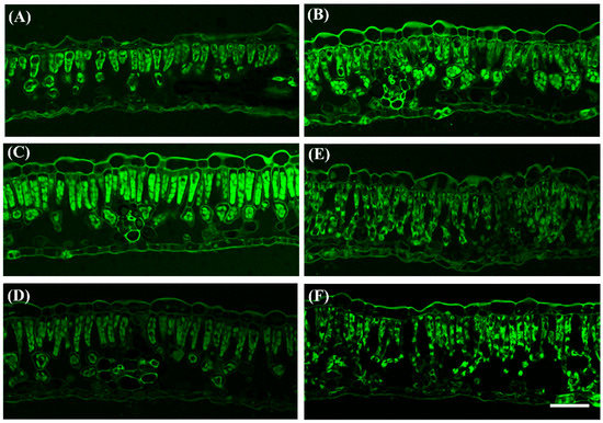 Paraffin sections were performed according to previously reported by Li et al. [93] with toluidine blue staining. The healthy and PMV-infected plant leaves were put into 20 vol of FAA fixative. The paraffin sections were prepared by dehydration, wax immersion, embedding, section, baking, dying, and sealing. Neutral gum was used as a sealant. Laser scanning confocal microscopy (Zeiss LSM 900, LSM Bioanalytik GmbH, Magdeburg, Germany) was used to observe the differences between healthy and PMV-infected leaves.
