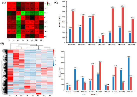 A principal component analysis (PCA) was performed with normalized read counts obtained from DESeq based on the prcomp function in the R environment (Figure 3A). The results showed that Y1 and Y2 had the highest correlation coefficient (0.99), followed by G2 and G3 (0.98) and G1 and CK (0.97). A total of 16,333 differentially expressed genes (DEGs) were identified in PMV-infected samples compared to noninfected plants (CK) (Table S8). To visualize the expression patterns of these DEGs at different samples, a heatmap was constructed on the basis of the fragments per kilobase of transcript per million mapped values (Figure 3B). DEGs with similar expression patterns were grouped, and the heatmap results showed that Y1 and Y2, G2 and G3, and G1 and CK have similar expression patterns. The numbers of genes exhibiting either upregulation or downregulation between two samples were depicted in Figure 3C, and the numbers of DEGs between Y1 and Y2, G2 and G3, and G1 and CK were relatively small. Taken together, these results suggested that the responses of small leaves at different positions to the PMV displayed a marked difference and PMV infection was less severe in newer green leaves (G1 sample). To validate the RNA sequencing data, ten key DEGs for this paper were selected for qRT-PCR analysis. The qRT-PCR results indicated that all of these DEGs exhibited similar expression kinetics to those obtained from the RNA sequencing analysis (Figure S4), thus supporting the validity of the method used for determining DEGs from the RNA sequencing analysis.