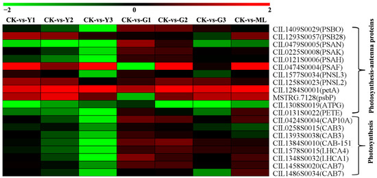 Heatmap of DEGs of photosynthesis and photosynthesis-antenna pathways. Responsive progression of genes expressions under different samples infection PMV compared to CK. Heat maps were drawn using the Log2 ratio (transformed FPKM value of PMV infection/those of CK). Detailed gene and expression data are provided in Table S14, available as Supplementary Data online.