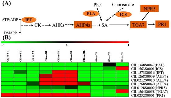 Model of cytokinin and SA action in response to PMV infection (A) and DEGs (B). Heat maps were drawn using the Log2 ratio. Detailed genes and expressions data are provided in Table S15, available as Supplementary Data online. PAL, phenylalanine ammonia-lyase; Phe, phenylalanine; ICS, isochorismate synthase; ATP/ADP, adenosine 5′-phosphates; DMAPP, dimethylallyl diphosphate; AHK, histidine kinase; AHP, histidine-containing phosphotransfer protein; SA, salicylic acid; TGA7, transcription factor TGA7; NPR5, non-expressor of PR gene 5; PR1, pathogenesis-related protein 1; IPT, adenylate isopentenyltransferase. The heat maps indicated the upregulation (red) and downregulation (green) of genes in PMV-infected samples compared to CK.
