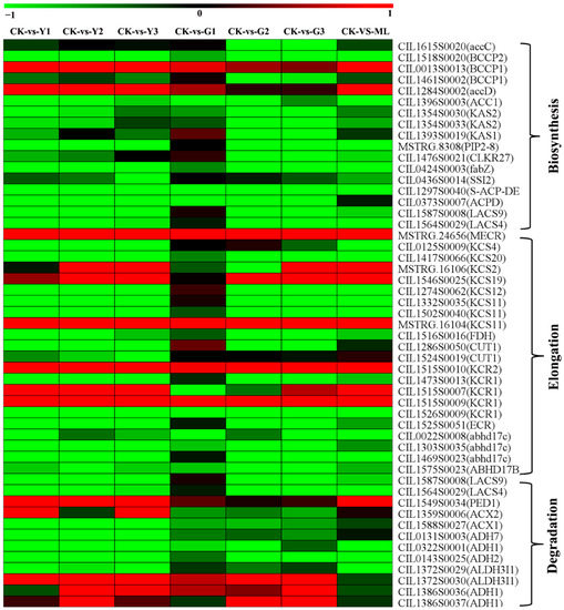 Fatty acid biosynthesis (Ko00061), elongation (Ko00062), and metabolism (Ko01212) pathways were detected through KEGG analysis (Figure 4). A total of 17 DEGs of fatty acid biosynthesis were altered significantly in PMV-infected samples compared to CK, and 15 genes were downregulated, including genes coded acetyl-CoA carboxylase 1 (ACC1), 3-oxoacyl-acyl-carrier-protein synthase (KAS), stearoyl-acyl-carrier-protein 9-desaturase (SSI2, ACPD), and so on. A total of 24 DEGs of fatty acid elongation were changed significantly, and 17 genes were downregulated, including eight genes coded 3-ketoacyl-CoA synthase (KCSs, FDH, and CUTs), two genes coded very-long-chain 3-oxoacyl-CoA reductase (KCR) and a very-long-chain enoyl-CoA reductase (ECR) (Figure 11 and Table S18). Moreover, many MYB transcription factors were detected, and most of these genes were downregulated (Figure 11 and Table S12). These results showed that the fatty acid and very-long-chain fatty acids (VLCFAs) biosynthesis were blocked in PMV-infected pecan plants.