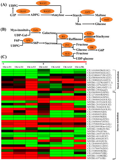 Carbohydrate metabolic pathways. (A) Starch biosynthesis and degradation pathway. (B) Sucrose biosynthesis and metabolism pathway. (C) Heatmap of DEGs of carbohydrate metabolic pathway. Responsive progression of genes expressions under different samples infection with PMV compared CK. Heat maps were drawn using the Log2 ratio (transformed FPKM value of PMV infection/those of CK). Detailed genes and expressions data were provided in Table S19, available as Supplementary Data online. WAXY, granule-bound starch synthase; GLGC, glucose-1-phosphate adenylyltransferase; AMY, alpha-amylase; malZ, alpha-glucosidase; UDPG, UDP-glucose; ADPG, ADP-glucose; G1P, glucose-1P; F6P, fructose 6-phosphate; RS, raffinose synthase; SPS, sucrose phosphate synthase; SUS, sucrose synthase; S6P, sucrose-6-phosphate; HK, hexokinase; STS, stachyose synthase; UDPG, UDP-glucose; UDP-Gal, UDP-galactose; GOLS, galactinol synthase. α-GAL, alpha-galactosidase; INV, beta-fructofuranosidase. The heat maps indicated the upregulation (red) and downregulation (green) of genes in PMV-infected samples compared to CK.