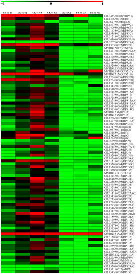 Heat map of DEGs of ribosome pathways (Ko03010). Responsive progression of genes expressions under different samples infection PMV compared to CK. Heat maps were drawn using the Log2 ratio (transformed FPKM value of PMV infection/those of CK). Detailed genes and expressions data are provided in Table S20, available as Supplementary Data online. The heat maps indicated the upregulation (red) and downregulation (green) of genes in PMV-infected samples compared to CK.