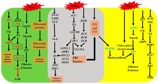 In our study, the expressions of JA biosynthesis-related genes (LOX2.1s, OPR1, OPCL1, ACX2, PED1) and JA signaling-related genes (JAZs and MYC2) were markedly increased in PMV-infected plants compared to the non-infection plants (Figure 9, Tables S15 and S17). Previous reports showed that the expressions of JA biosynthesis-related genes (OsOPR7, OsLOXs) and JA signaling-related genes (OsMYC2, OsJAZ12) were markedly increased in RBSDV-infected Nip plants compared to mock-inoculated Nip plants, and the JA concentration was more than six-fold greater in RBSDV-infected Nip than that in mock-inoculated Nip plants [12]. These results showed JA biosynthesis played a positive role against pathogen attacks.