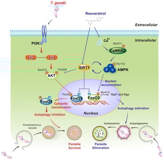 Lee J, Kim J, Lee J-H, Choi YM, Choi H, Cho H-D, Cha G-H, Lee Y-H, Jo E-K, Park B-H, et al. SIRT1 Promotes Host Protective Immunity against Toxoplasma gondii by Controlling the FoxO-Autophagy Axis via the AMPK and PI3K/AKT Signalling Pathways. International Journal of Molecular Sciences. 2022; 23(21):13578. https://doi.org/10.3390/ijms232113578