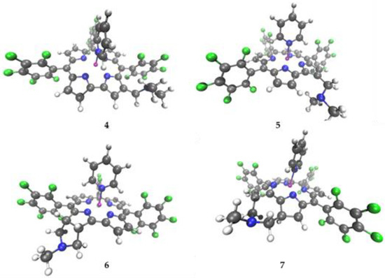 Structures for compounds 4, 5, 6, and 7 optimized with MOPAC2016 [59] (in all images, atom colors are: hydrogen (white), carbon (gray), nitrogen (blue), fluorine (green), and gallium (magenta)).