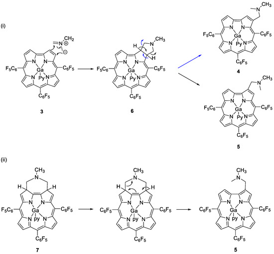 The isolation of amines 4 and 5 prompted us, in a first analysis, to propose as plausible formation pathways the thermal ring opening of potential cycloadducts 6 or 7 (Scheme 2, pathways (i) and (ii), respectively). However, this type of cleavage is very unlikely. Although there are some examples in the literature for pyrrolidines, this type of ring opening was never observed in clorins nor in other types of porphyrinoids, such as porpholactones, when reacted with ylides [57].