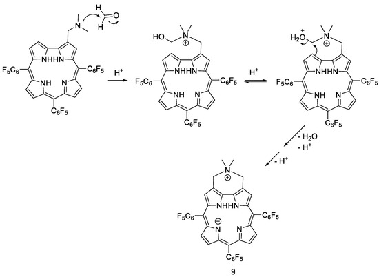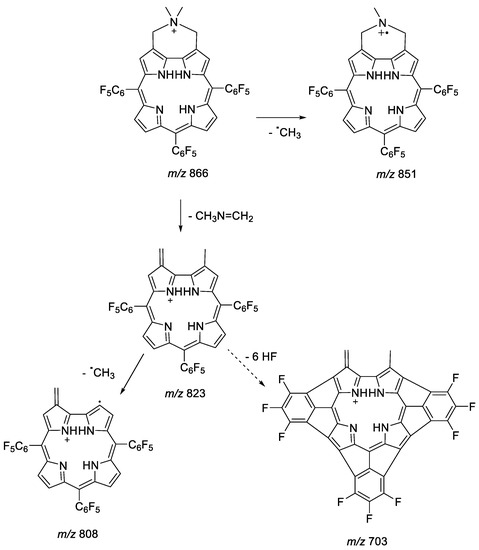 The presence of the protonated molecular ion at m/z 866 in the mass spectrum of compound 9 (see Figure S16) supports the proposed structure. Interestingly, this ion justifies various product ions, namely the ion at m/z 823 that merits special attention due to its high relative abundance. The formation of this ion can be justified by the loss of CH3N=CH2 (Scheme 6). The combined loss of this fragment and a methyl radical gives rise to the formation of the ions with m/z 808. Other less abundant ions were also observed, probably formed from combined losses of CH3N=CH2 plus one to six HF molecules, giving rise to the ions at m/z 803, 783, 763, 743, 723, and 703, respectively (Figure S17). The formation of product ions from successive losses of HF where already reported for other corrole derivatives and for porphyrins bearing pentafluorophenyl groups [62,63,64,65].
