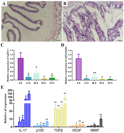 H&E staining of the intestinal tissue sections of (A) the 0 h group and (B) the SUS group. Temporal expression of tight junction proteins in V. splendidus-infected sea cucumber intestinal tract: (C) AjZO-1 and (D) Ajoccludin. (E) The expression of inflammatory factors IL-17, p105, TGFβ, VEGF, MMIF at different infectious times of A. japonicus infected with V. splendidus, with a final concentration of 1 × 107 CFU mL−1. Asterisks indicate significant differences: * p < 0.05 and ** p < 0.01.