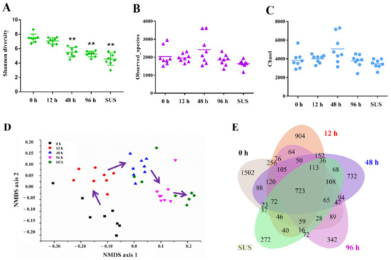 V. splendidus infection adjusted the gut microbiota in sea cucumber. (A) Shannon diversity index after 48 h groups. (B) Observed_species index and (C) Chao1 index have no significant differences. (D) Non-metric multidimensional scaling (NMDS) of the gut microbiota after V. splendidus infection. (E) Overlap between detected species among the different groups after V. splendidus infection of the sea cucumber. Asterisks indicate significant differences: ** p < 0.01.