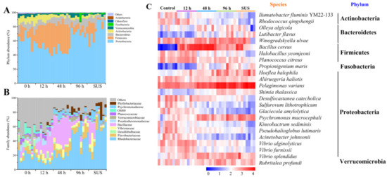 Bacterial taxonomic profiling at the (A) phylum and (B) family levels. (C) Heat map exhibiting the relative abundance (log2 transformed) of the 24 key species identified using the random forest method among the different groups after V. splendidus infection. The relative values for the bacterial species are indicated by the color intensity.
