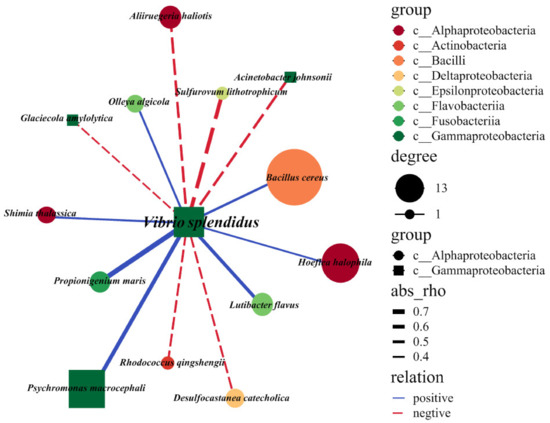 To reveal which resident taxa activate or repress the pathogen, we focused on the modules of V. splendidus. We identified 13 OTUs that interacted directly with V. splendidus during the infection (Figure 4). The types of interaction between the core OTUs and V. splendidus exhibited a distinct distribution. For example, Psychromonas macrocephali, Propionigenium maris, Bacillus cereus, Lutibacter flavus, and Hoeflea halophila reacted positively to V. splendidus infection, whereas Aliiruegeria haliotis, Sulfurovum lithotrophicum, Acinetobacter johnsonii, Glaciecola amylolytica, Rhodococcus qingshengii, and Desulfocastanea catecholica reacted negatively to V. splendidus during the process of the V. splendidus infection of the sea cucumber (Figure 4). Psychromonas macrocephali, Hoeflea halophila, and Bacillus cereus had higher abundances than the bacteria with negative networks.