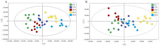 The samples were analyzed under LC–MS positive and negative ion detection modes. Since not all lipids can be efficiently ionized in one mode, positive and negative ion electrical pulses were used. The mass spectral data were processed by multivariate analysis. Approximately 947 peaks of positive ions (ESI+) and 441 peaks of negative ions (ESI−) were detected by Micromass Marker Lynx when using the same acquisition method from 0 to 34 min of retention time. We normalized the peak value and analyzed the pareto-scaled data through PCA, PLS-DA, or OPLS-DA. PCA is an unsupervised clustering method, which is used to reveal the system trend and ‘clustering’ in multivariate data. The PCA score plots highlight the formation of clusters or patterns two-dimensionally, thus showing the similarities and differences between the samples. PCA was used to analyze the intestinal lipid metabolism profile to reveal the effects of V. splendidus infection on the intestinal lipid metabolism of the sea cucumber. In the ESI+ and ESI− modes, the cluster formation of the first two components was time-dependent, which explained 62.5% and 51.9% of the total variance, respectively (Figure 5). The further model validation using PLS-DA shows that the permutations are equal to 200, generating intercepts with R2 = 0.372 and Q2 = −0.178. Together with the results obtained in the negative mode, these results show that the OPLS-DA model was well-suited and statistically valid. The same conclusion was reached when using the supervised projection method, PLS-DA. The first two components were observed at different times of the V. splendidus infection and in the control groups in both the ESI+ and ESI− modes.