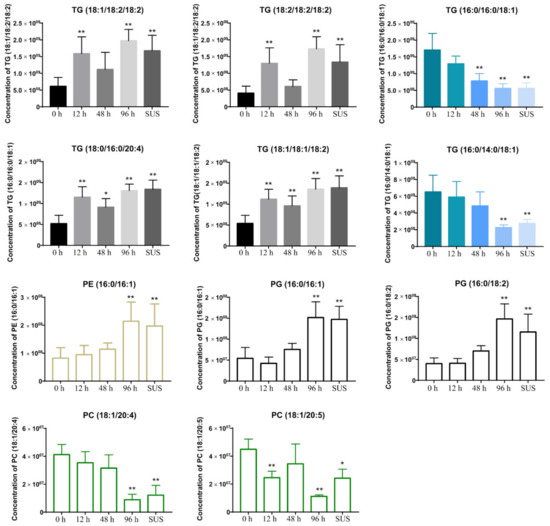 The S-plot shows the covariance and correlation between the metabolites and can thus be used to identify the pivotal metabolites [29]. The significant metabolites at the top and bottom of the S-plots (Figure S1) were associated with group separation. Based on the parameters of variable importance in prediction (VIP), the top 25 lipid metabolites in both the ESI+ and ESI− patterns served as potential biomarkers (Table S5). The levels of triglycerides (TG) (18:1/18:2/18:2; 18:2/18:2/18:2; 18:0/16:0/20:4; 18:1/18:1/18:2) increased 12 h after V. splendidus infection, and the levels of TG (16:0/16:0/18:1; 16:0/14:0/18:1) decreased 48 h after V. splendidus infection. Furthermore, the phosphatidylethanolamine (PE) (16:0/16:1) and phosphatidylglycerol (PG) (16:0/16:1; 16:0/18:2) levels were increased in the 96 h and SUS groups after V. splendidus infection, and the phosphatidylcholine (PC) levels (18:1/20:4; 18:1/20:5) were decreased after V. splendidus infection (Figure 6).