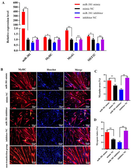 The miR-381 promoted differentiation of caprine skeletal muscle satellite cells (SMSCs). (A) Expression levels of miR-381 and myogenic differentiation marker genes MyHC, MyoG and MEF2C in differentiated caprine SMSCs transfected with miR-381 mimic, miR-381 inhibitor and their corresponding negative control (NC) groups. (B) The effect of miR-381 on the formation of MyHC-positive myotubes detected by anti-MyHC immunofluorescence staining. Relative myotube area (C) and myogenic index (D) of differentiated caprine SMSCs counted by ImageJ software v1.8.0 (NIH, Bethesda, MD, USA). * p < 0.05 and ** p < 0.01.