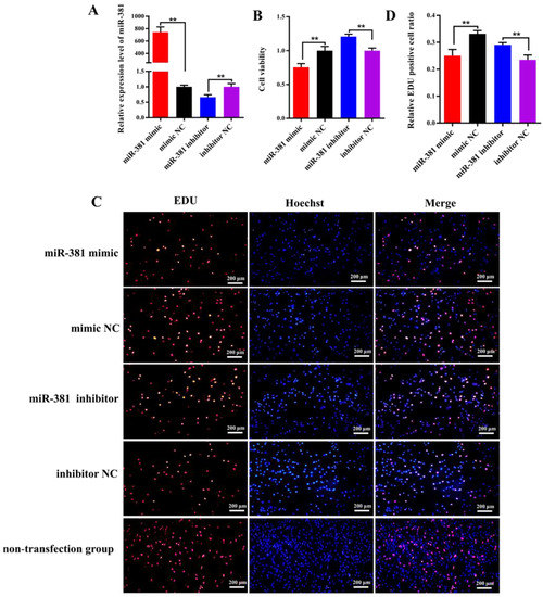 The miR-381 suppressed the viability and proliferation of caprine skeletal muscle satellite cells (SMSCs). (A) Transfection efficiency detection of miR-381 mimic and miR-381 inhibitor. (B) The effect of miR-381 on the viability of caprine SMSCs when miR-381 mimic and miR-381 inhibitor were transfected into SMSCs. (C) The effect of miR-381 on the proliferation of SMSCs detected using EDU assay. EDU, Hoechst and Merge represent the number of EDU-positive SMSCs, the total number of SMSCs and the proportion of EDU-positive SMSCs in the total SMSCs, respectively. (D) The percentage of EDU-positive SMSCs counted by ImageJ software. ** p < 0.01.