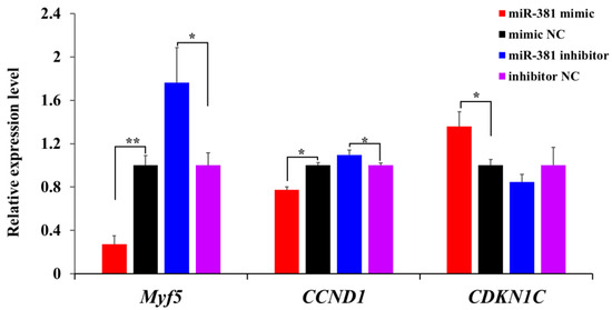 The effect of miR-381 on the expression levels of three proliferation marker genes Myf5, CCND1 and CDKN1C in caprine SMSCs detected using RT-qPCR. * p < 0.05, ** p < 0.01.