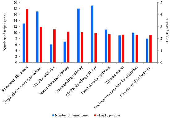 The top 10 KEGG pathways enriched for predicted target genes of miR-381. The left-hand Y-axis represents the number of the target genes of miR-381 involved in a pathway, while the Y axis on the right side shows the value of −Log10 (p-value).