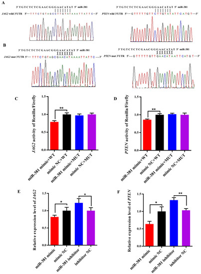 Validation of predicted target genes of miR-381 using dual luciferase reporter assay. (A) The binding sequences of miR-381 with the 3′UTR of JAG2 and PTEN in wild-type dual luciferase reporter vectors. (B) The complementary sequences of the binding sequences in mutant-type dual luciferase reporter vectors. (C,D) The luciferase activities of the target genes JAG2 and PTEN for miR-381 detected by dual luciferase reporter assay. (E,F) The effect of miR-381 on the expression levels of JAG2 and PTEN. * p < 0.05 and ** p < 0.01.