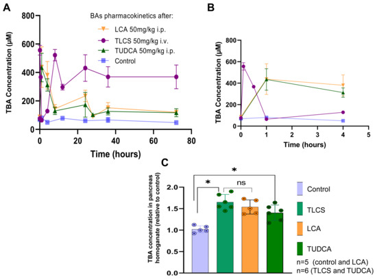 2.2. BAs Were Elevated in the Serum and Reached the Pancreas after Intravenous or Intraperitoneal Administration in Mice