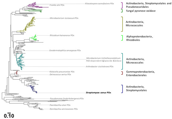 Pyranose oxidases have been characterized mainly from wood-degrading fungi, where they are secreted extracellularly and associated with membrane-bound vesicles or other types of structures of fungal hyphae [9]. To date, POxs of fungal origin were biochemically characterized from Aspergillus oryzae, Aspergillus nidulans, Irpex lacteus, Lyophyllum shimeji, Peniophora gigantea, Peniophora sp., Phanerochaete chrysosporium, Phlebiopsis gigantea, Trametes multicolor (ochracea) and Tricholoma matsutake [3,6]. Already, in 2009, it was hypothesized that pox genes first evolved in bacteria and were then introduced into fungi via horizontal gene transfer [10]. A newly constructed phylogenetic tree (Figure 1) confirms the close relationship between putative bacterial and fungal POx sequences, despite their sharing sequence similarities of only 26 to 39%. It also shows that putative bacterial POxs are mainly found in the phyla of Actinobacteria and Proteobacteria.