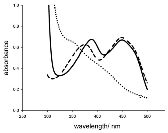 UV-Vis spectra of ScPOx showed the characteristic FAD peaks with maxima at 390 nm and 450 nm. These two peaks disappeared upon reduction of the enzyme with 4 M d-xylose, which is a characteristic for FAD-dependent oxidoreductases (Figure 2). Release of the prosthetic group after TCA treatment showed a blueshift of the flavin peaks, again indicating a noncovalent association of FAD with the polypeptide. The FAD occupancy, as calculated from the molar extinction coefficient of the enzyme (ε280 = 10,928 M−1 cm−1) and released free FAD, was determined to be ~100%. This means that one FAD molecule is bound to one monomer of the enzyme.